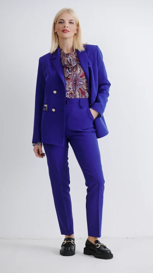 Η γραμμή του σακακιού είναι μελετημένη ώστε να αγκαλιάζει τη σιλουέτα χωρίς να τη στενεύει. Οι χρυσές λεπτομέρειες στα κουμπιά και στα μανίκια προσδίδουν διακριτική πολυτέλεια — αυτή τη μικρή πινελιά που κάνει τη διαφορά. Το παντελόνι ακολουθεί ίσια γραμμή, που χαρίζει ύψος και επιμήκυνση στο πόδι, δημιουργώντας ένα σύνολο που αποπνέει δυναμισμό και εκλεπτυσμένο ύφος.