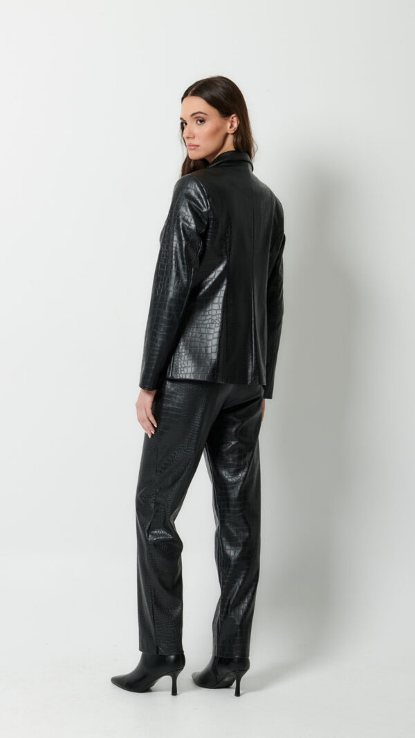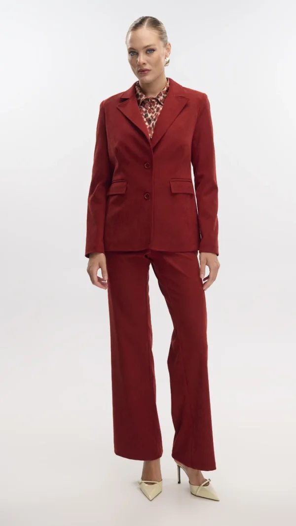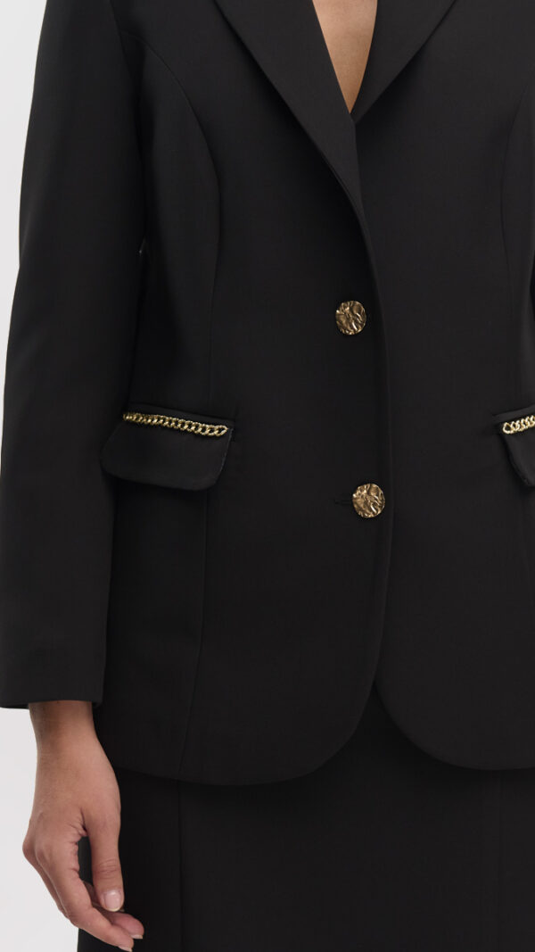 Το ύφασμα του είναι σταθερό αλλά μαλακό στην υφή, προσφέροντας άψογη εφαρμογή και σχήμα που κολακεύει τη σιλουέτα. Η μονοκουμπωτη γραμμή του χαρίζει κομψότητα και αναδεικνύει τη μέση, ενώ οι μαύρες λεπτομέρειες στα πατιλέτα των τσεπών και στα τελειώματα προσθέτουν μια διακριτική αντίθεση που απογειώνει το look.